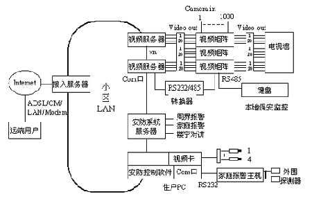 远端用户经Internet找到小区局域网的外部IP地址,经权限验证后由接入服务器的IP内部地址绑定,找到相应的视频服务器,经CCTV控制软件对视频矩阵的1000个视频输入进行调用切换。