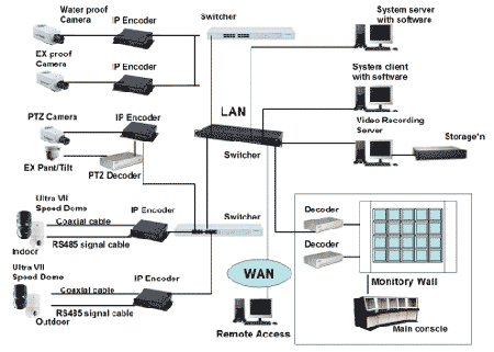 鉴于IP摄像机在镜头选择性,环境适应性,性价比等方面的问题,多数数字系统仍会选择传统模拟摄像机/快球与IPENCODER(单路,回路,八路等)相配合使用。该系统中使用TYCO470固定摄像机和ULTLAVII917快球作为外围监控设备,包括防水/防爆等不同配置以适应不同环境的要求,中心机房使用中心控制软件,客户端软件,存储管理软件对外围CAMERA图象进行切换控制,存储管理,而远端用户则使用客户端软件经WAN登录实现远程监控,调用图象,快球PTZ控制。
