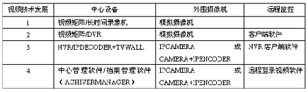随着视頻技术数字的发展,企业视頻监控系统也经历了从传统模拟摄像机加视頻矩阵,模拟摄像机加数字视频录像机DVR,网络摄像机IPCAMERA(或模拟摄像机/视频服务器IPENCODER)加NVR网络视频录像机,以及最新中心管理软件/远程客户端软件直接调用控制外围IP摄像机。具体参见下表: