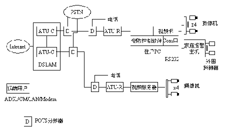 基于ADSL/CableModem点对点方式的远程监控系统结构如图2所示。住户家庭若有PC机,则在PC上增加一视频捕获卡,可接入1-4路模拟摄像信号。而ADSL用户传输单元ATU-R可充当视频处理的网络接口,经双绞线与ISP机房内DSLAM数字用户线访问多路复用器中的ATU-C(机房端ADSL收发单元)相联。住户家庭若无PC机,则可采用将视频捕获卡与MPEG压缩部分集成在一起,构成一视频服务器的方法。远端用户采用ADSL/CM/LAN/Modem等接入方法,接入Internet,再根据住户ADSL下的IP地址找到家庭内的PC或视频服务器,提取经MPEG压缩的图像信号,对家中老人、小孩、病人进行图像观察和语言交流。只是住户处需将数字图像上行至Internet,故速率将受限于ADSL的上行速率(64k-640kbps)。通过CableModem工作时,情况基本相同,只是ATU-R换成CableModem,DSLAM换为CMTS,而且HFC图像上行速率最大可达1.5Mbps,速率将高于ADSL的最大上行速率,但HFC存在带宽共享的问题