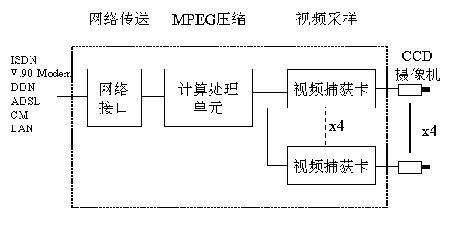 具体作为图像压缩的解决方案,CCD摄像机输出的模拟视频信号送入视频服务器(IPEncoder)的视频捕获卡,进行视频采样、A/D转换,将模拟视频信号转成数字信号。之后送入计算处理单元进行MPEG压缩,最后将压缩后的数字视频信号送入网络接口,经网络传送至远端。详见图1。