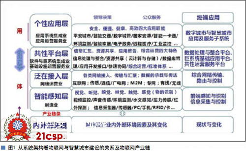 伴随着国家十二五规划将物联网纳入七大新兴战略发展产业的指引,基于物联网蓬勃兴起的业务与应用逐渐成为数字城市乃至智慧城市的主流应用,并且物联网能够更快的提升数字城市应用系统间的融合与协作度。可以说,正是物联网技术的出现,使数字城市的发展进入到了一个新的天地,物联网与数字城市建设的有机融合,也催生了一个新的应用型产业--智慧城市建设产业。因此,我们可以得出这样的结论:物联网与智慧城市建设即同一事物的体与用的关系,物联网是智慧城市建设的技术基础,智慧城市是物联网发展的具体应用,技术与应用的完美结合,将充分发挥系统的精确预测、科学决策、统筹管理、资源共享等功能,而物联网与智慧城市的结合程度,将是产业落地的关键、技术惠民的重心。物联网与智慧城市的关系、物联网架构、物联网产业链等几个复杂的问题,我们大致可以通过下面这张直观的图示得以了解(图1中共性平台层与个性应用层可合并为一大层,与业内人士多提出的物联网三层架构并无矛盾)。