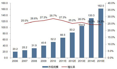 根据弗若斯特沙利文咨询公司研究,2010年城市视频监控管理平台产品设计和生产的市场规模大约是52.2亿元人民币,较2009年增长28.7%。预计在“十二五”安防行业良好的整体政策环境影响下,产品市场技术不断革新,以及城市安全意识和需求不断提升的综合影响下,该市场将会在今后五年(2011-2015)保持良好的发展势头。预计到2015年,中国城市视频监控管理平台产品设计和生产的市场规模将达到162亿人民币,2010至2015年复合年均增长率为25.4%。