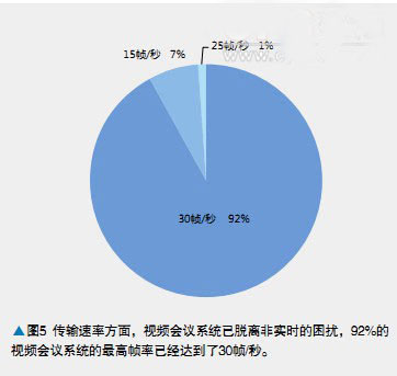 从最大图像分辨率来看,有39%以上的视频会议系统采用1024×768分辨率,另外有24%的视频会议系统采用1280×1024分辨率,而704×576分辨率的视频会议系统占比为19%。更低分辨率的视频会议系统的占比不到20%。这说明向高清分辨率发展是视频会议系统的主流。