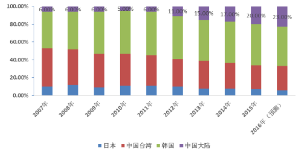 近十年来我国LCD的产业高速发展,已经达到了一个比较成熟的市场,高世代的面板线已经是我国液晶面板业的主要构成。但是产业的上游的许多核心技术依然被日韩等厂商所掌握,且我国的液晶面板市场占有率仍然不及韩国、中国台湾。但随着几条高世代生产线的陆续满产,我国液晶面板的占有率将持续上升。
