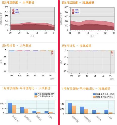 海康威视和大华股份一直占据视频监控系统前列,1月分项平均值均超出行业平均总分45%以上