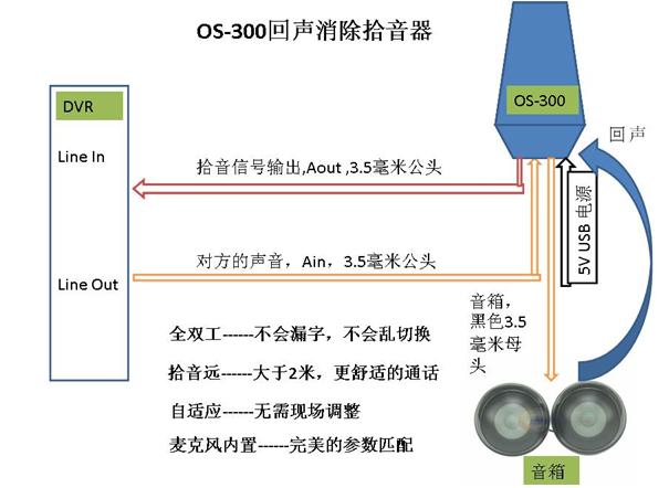我们选取了目前国内回声抑制做的比较好的厂家作为例子讲解——艾力特音频的OS-300回声消除拾音器 。通过下图对比可以看出,OS-300在拾取本地声音的同时,也对本地喇叭播放的声音进行了采样,进而从本地拾取的声音信号中去除喇叭里播放的声音信号。这样传输到远端的声音将只有本地讲话人的声音,远端人员也不会听到自己的回声。因其内部的非线性回声消除算法,不仅能有效消除语音对讲中的回声;更能保证较好的双向通话效果。加上自动噪声电平平衡功能,能有效的抑制房间环境噪声和系统噪声,提高音频信号的清晰度,所以相对市面上普通厂家来说,OS-300拾音效果及回声处理效果得到了大大的提升。