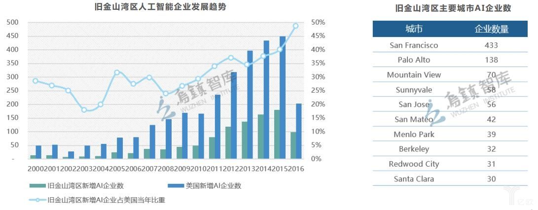 1、2000至2016年,美国人工智能企业占全球人工智能企业总数的37.4%,其中超过1/3的企业位于旧金山湾区。近年来,旧金山湾区每年新增AI企业数占当年美国新增AI企业总数的比例在持续上升,2000年这一比例接近30%,2016年则已接近50%。