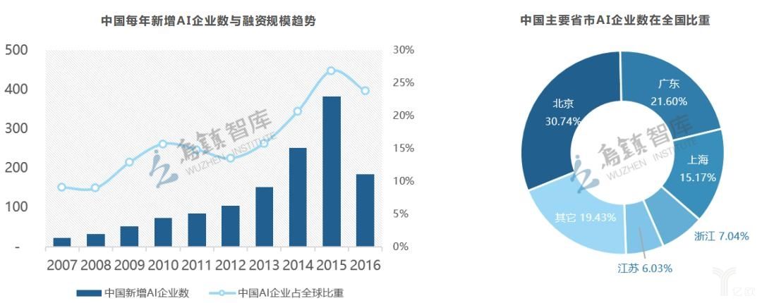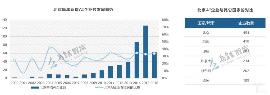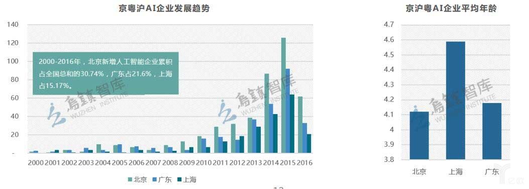 2000至2016年,中国是新增人工智能企业数上,京粤沪位列前三。北京的人工智能企业数占全国总数的30.74%。截至2016年,北京的人工智能企业数已经超过全球除美国外的其它国家。