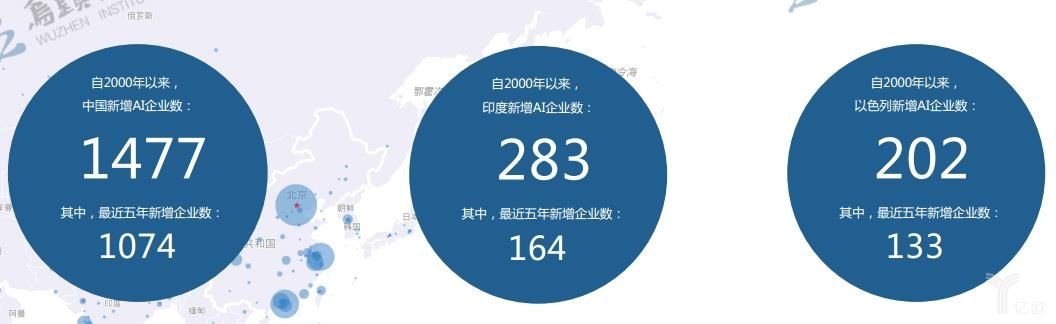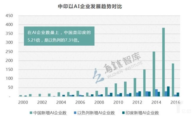 从2000到2016年,中国人工智能新增企业数占亚洲人工智能企业总数的68.67%,印度紧随中国之后,但仅占亚洲人工智能企业总数的13.2%,以色列则为9.4%。