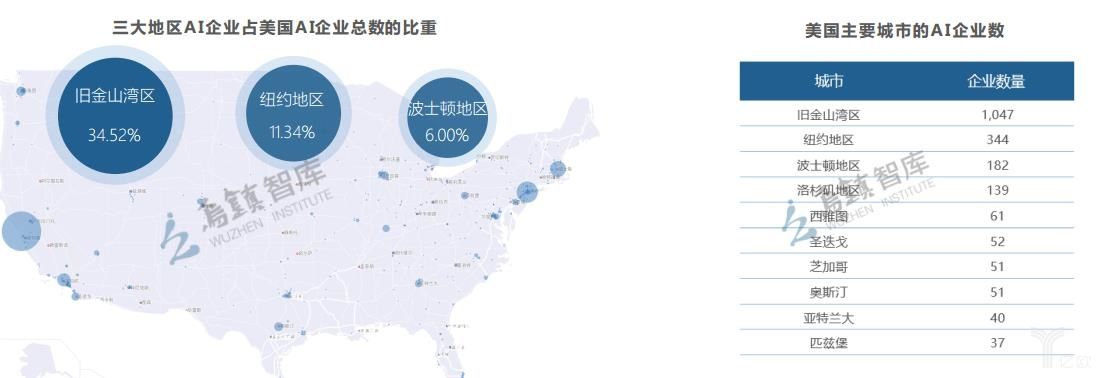 从表中数据可以看出,美国的人工智能企业主要集中于东西海岸。东海岸以纽约地区、波士顿地区为代表,西海岸以旧金山湾区、洛杉矶地区、西雅图等为代表。