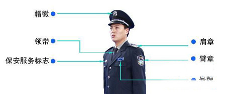 在新版服装上,设计方专门设计了保安服务的专用标志。保安服务标志及服装服饰上的相关图案为:变形盾牌、八角星、麦穗和飘带。