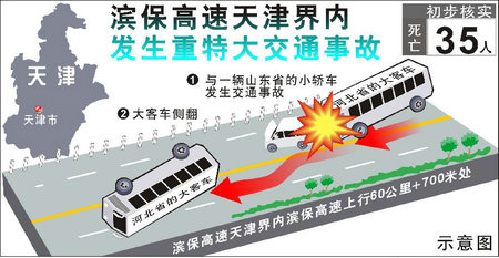 7日15时50分,唐山交通运输集团一辆大型客车(核载53人,实载55人),在滨保高速天津境内与一辆山东牌照小型客车追尾侧翻,造成35人死亡、19人受伤。事故发生后,天津市委、市政府和有关部门领导立即赶赴现场,全力组织开展救援工作,抽调了全市有关医疗专家全力救治伤员。