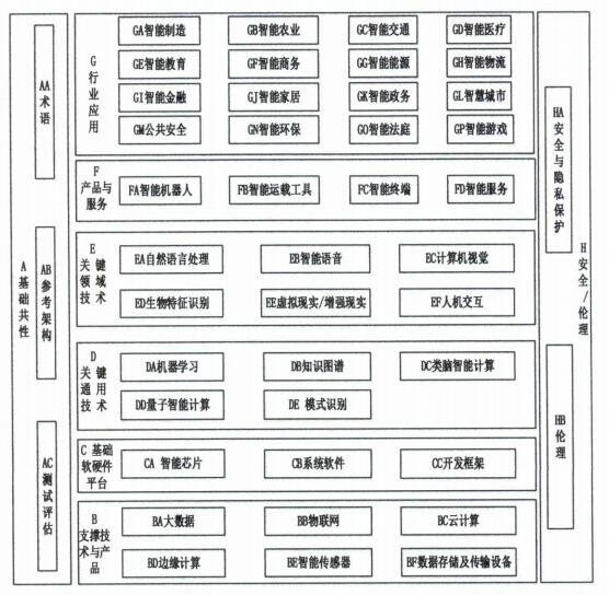 《指南》明确人工智能标准体系结构包括“A基础共性”、“B支撑技术与产品”、“C基础软硬件平台”、“D关键通用技术”“E关键领域技术”、“F产品与服务”、“G行业应用”,“H安全/伦理”等八个部分。