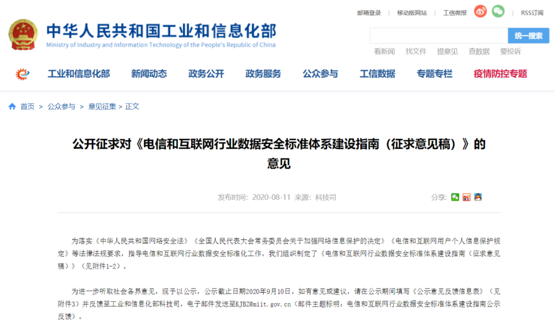 8月11日,从工信部网获悉,为落实《中华人民共和国网络安全法》《全国人民代表大会常务委员会关于加强网络信息保护的决定》《电信和互联网用户个人信息保护规定》等法律法规要求,指导电信和互联网行业数据安全标准化工作,工信部公开征求对《电信和互联网行业数据安全标准体系建设指南(征求意见稿)》的意见。
