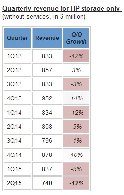 为什么说HP要好一些,因为HP的融合存储(3PAR,StoreOnce,StoreAll,etc)是增长的,下滑的是传统的存储s(EVA,MSA,tape)。也就是随着3par销售的增长,可能很快就可以抵消传统存储的下降。