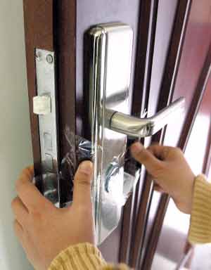 业主叶小姐刚刚收楼,搬家本是件喜事,但是美中不足的是,由于不少人家在装修、搬家,每天出入小区的人员很杂,叶小姐发现自己家的门锁孔竟然被人用火柴棍堵住了,经过多次盘问,也没有查到究竟谁是肇事者。为避免此事件再次发生,叶小姐绞尽脑汁。一个偶然的机会,叶小姐在电视上看到一则防盗妙招:用一卷宽胶布、一管强力502胶水(俗称万能胶),以及一些短钉,先把短钉粘在胶带上,把有尖的一面朝上,然后贴在自家的门锁上,再用黄色的胶带覆盖在上面,然后再在黄色胶带上涂上强力502胶水。叶小姐昨日告诉记者,她已经用小棍做了尝试,502胶水的黏性超强,小棍一碰就会被粘住,如果要挣脱,就会碰到藏在下面的钉子,想必存心捣乱的人为了避免皮肉之苦,就会对她家避而远之。