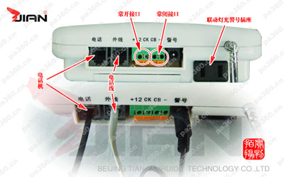 如果我们需要安装红外对射、红外防盗栅栏或其他有线探测器,就需要使用有线的接口了:从右面的图中我们可以看到,这一台机器有两个有线接口:1个是常开接口,1个是常闭接口。我们一般使用常闭接口。但要主意的是:有线探测器的接线也必须和主机的接口一致,是常闭接口。