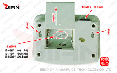 1、打开主机的电池盒盖,记录主机的编码并保存,装入电池(本款主机使用普通的电池,没有浮充装置。请选用质量较好的电池使用);
