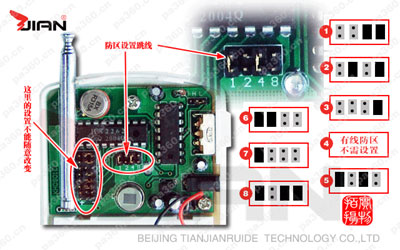 这时候,我们已经清楚:通过对探测器防区的调整和配置,就可以实现按需布防。如何对探测器进行防区的调整?这时大家比较关心的问题,也常常是比较头痛的问题,其实并不复杂。这里对防区定义的原理就不作解释。大家只要按照下面图中的方式调整4个插针的位置就可以了: