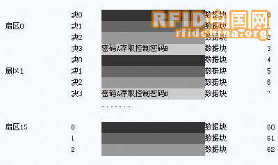 M1卡分为16个扇区,每个扇区由4块(块0、块1、块2、块3)组成,(我们也将16个扇区的64个块按绝对地址编号为0~63,存贮结构如下图所示: