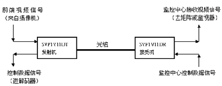 视频的传输途径为:从前端摄像机下来的视频信号进入光发射机(SVP1V11DT)的VIDEO IN接口,电信号转换成光信号。光信号通过光缆传输到监控指挥中心的光接收机(SVP1V11DR)。光接收机将光信号还原成视频信号进入监视器或者监控矩阵。