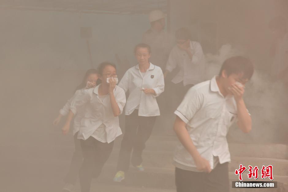 4月3日上午,广西教育厅在南宁市第三十三中学举办全区中小学幼儿园反暴恐应急演练活动,以进一步加强中小学、幼儿园师生反恐安全防范意识,提升校园内部保卫组织应急防暴反恐能力,切实做好校园安全防范工作。图为学生在消防疏散应急演练中逃离“失火”教学楼。