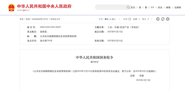 2025年2月10日,国务院发布《公共安全视频图像信息系统管理条例》,自2025年4月1日起施行。该《条例》共34条,以行政法规的形式对公共安全视频图像系统的规划、建设、使用、管理和监督作出全面规定。核心内容包括严格规范建设以杜绝非法乱建、明确各方管理责任、强化个人信息保护力度,并设定了严格的法律责任。