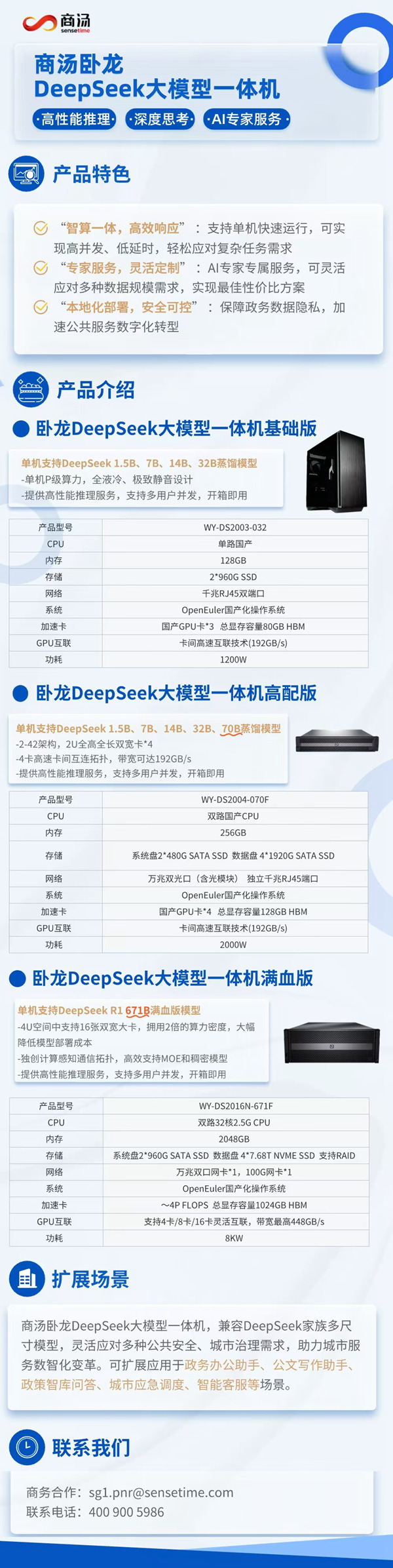 “商汤卧龙DeepSeek大模型一体机+商汤方舟多模态新智平台+AI专家服务”的全方位产品方案,可应用于政务办公助手、公文写作助手、政策智库问答、城市应急调度、智能客服等公共服务业务场景。