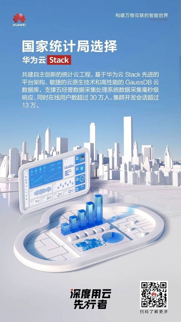 经过充分调研和考察,华为云Stack在云平台、数据库、大数据的全栈自主创新能力和在政务领域的持续积淀,获得了国家统计局的认可。国家统计局联合华为公司提前布局,以“一网通办、一云统管”为目标,规划实施了全自主创新环境的统计云工程,高效助力“五经普”工作开展。