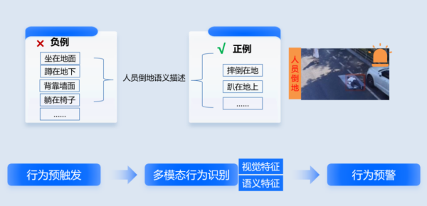 例如准确识别人员跌倒,将能为救援争取到更多宝贵时间。在原视觉识别方案中,坐姿、躺卧等状态由于相似度较高,容易被判断为人员倒地。升级多模态大模型后,结合人员倒地语义描述,坐在地面、蹲在地下、背靠墙面等相似姿态将被过滤,让跌倒预警更快、更准。