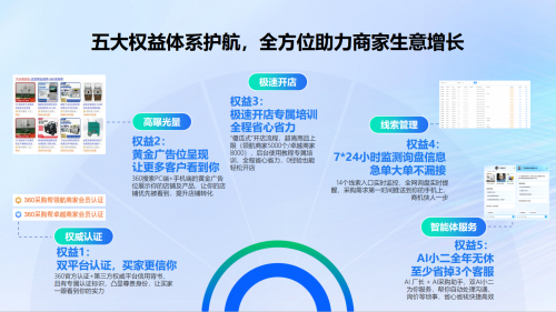 2、会员服务:针对B2B商家日常经营的核心场景,360采购帮推出五大会员权益,全方位助力商家生意增长。