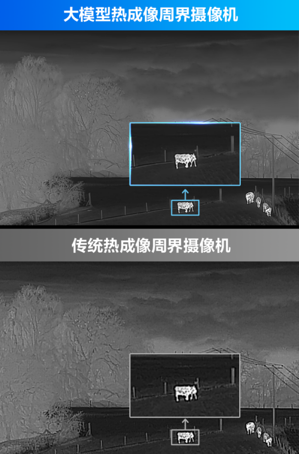 *通过局部图像放大可以看到,传统摄像机成像噪点多、轮廓不清晰,大模型摄像机成像画面更细腻、轮廓更清晰。