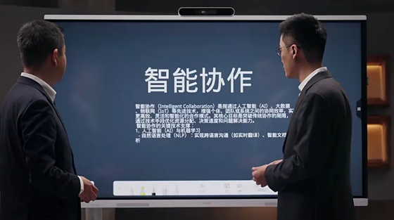 而作为连接用户的重要入口,IdeaHub S3自带的白板也早已接入DeepSeek大模型。崔凯随手在白板上写下“智能协作”四个字,AI就立即开启了智能识别,把字体自动转化为工整清晰的打印体,在点击一旁的AI搜索按钮后,就立刻弹出DeepSeek的对话框,基于“智能协作”这个关键词直接生成相关的补充文字、数据和案例。