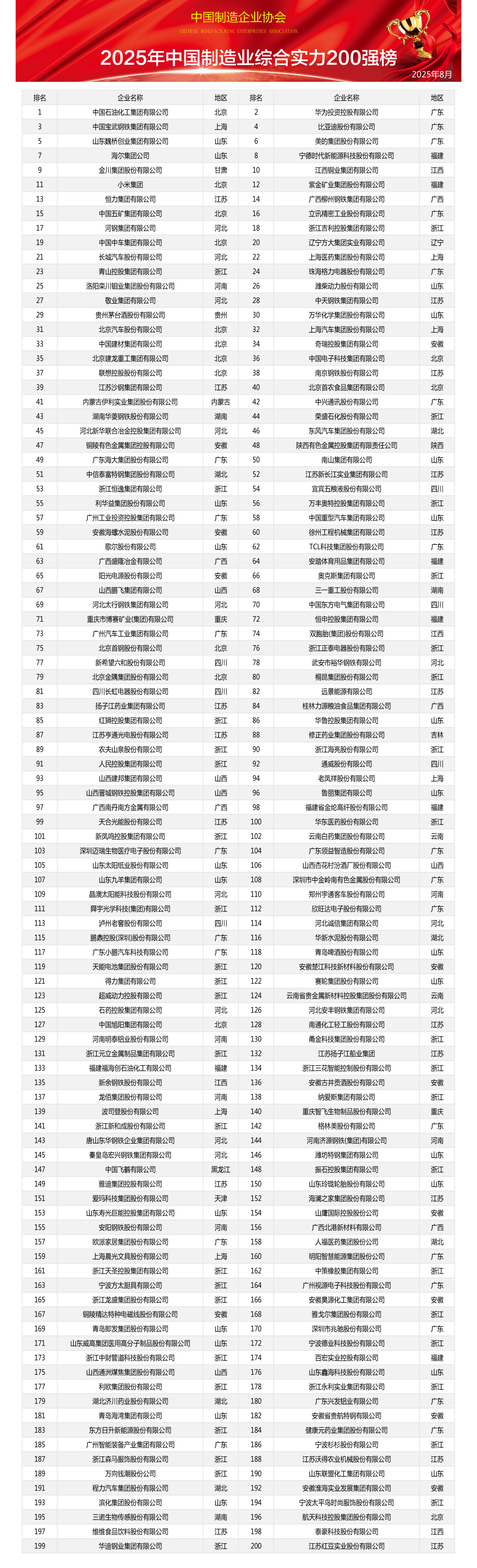 从2025中国制造业综合实力200强榜单来看,企业分布呈现出明显的区域集聚特征。浙江省表现尤为突出,有浙江吉利控股集团有限公司、青山控股集团有限公司、荣盛石化股份有限公司等多家知名企业入围,且不少企业排名靠前。广东省同样实力强劲,华为投资控股有限公司、比亚迪股份有限公司、美的集团股份有限公司等位居前列,体现了其在信息技术、新能源汽车、智能家居等领域的深厚根基。此外,山东、江苏、北京等省份(直辖市)也有众多实力雄厚的企业上榜,共同构成了中国制造业的强大阵营。