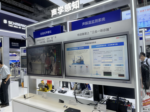 在声学感知展区,声音不仅可以听出故障,还能“看见”隐患,为工艺过程质检和设备设施运维管理提供可靠解决方案。例如声振温监测系统用一个探头就能实时监测工业设备的声音、振动、温度,及时发现异常,保障产线正常运转;在线式声像仪则可以通过声音“看见”隐患,定位气体泄漏、局部放电等位置,助力变电站、液化气站等提升安全管理水平。