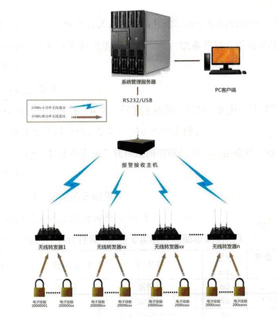系统由电子挂锁、电子钥匙、智能手持机、无线转发器、无线接收主机、电子钥匙