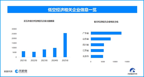 天眼查专业版工商信息数据显示,截至目前我国现存在业、存续状态的低空经济相关企业超10万家。其中,2025年新增注册相关企业超2.5万余家,从企业注册数量趋势来看,近五年间,低空经济相关企业的注册数量呈现稳步增长态势,但在2025年呈现出显著增长,同比增长达162.36%,并达到峰值。