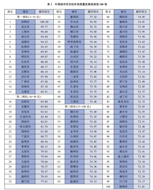 中国城市低空经济高质量发展指数前100强
