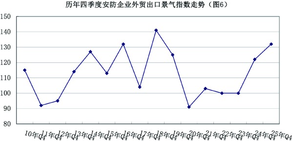 从安防行业来看,2025年四季度外贸出口景气指数为132,比上季度上升了19点,比去年同期上升了10点,位于“较景气区间”(见图6)。外贸景气指数创了近年6来的新高。其中,有42%的调查企业国外订单有了新的增长,比上季度上升了10个百分点;有48%的企业反映销售“持平”,比上季度下降了1个百分点;有10%的企业反映“下降”,比上季度下降了9个百分点。