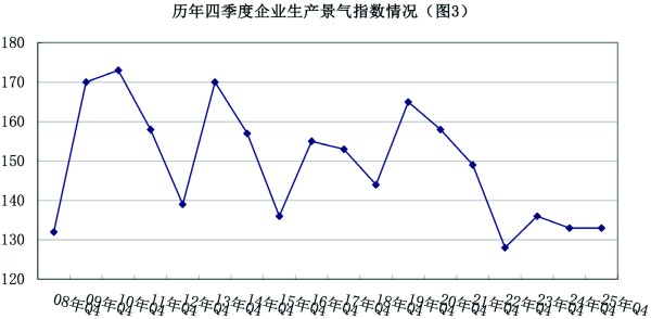 2025年四季度,安防行业生产(施工)景气指数为133,比上季度上升了6点,与去年同期持平,位于“较景气区间”(见图3)。在调查对象中,有50%的企业反映生产(施工)规模比上季度扩大,比上季度上升5个百分点;有33%的企业反映与上季度持平,比上季度下降了4个百分点;有17%的企业反映生产(施工)规模减少,与上季度相比下降了1个百分点。