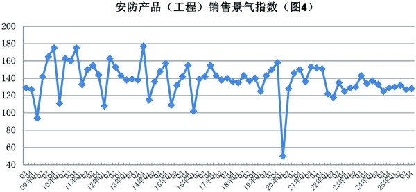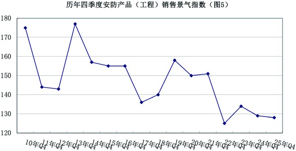 2025年四季度,安防产品(工程)销售景气指数为128,比上季度上升了1点,与去年同期相比下降了1点,位于“较景气区间”(见图4-5)。其中,有38%的调查企业销售额有了新的增长,比上季度下降了5个百分点;有52%的企业反映销售“持平”,比上季度上升了11个百分点;有10%的企业反映“下降”,比上季度下降了1个百分点。