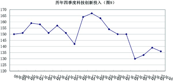 2025年四季度,企业科技投入景气指数为136,与上季度相比下降了5点,与去年同期相比下降了3个百分点,(见图9)。其中,有44%的企业继续增加了科技研发资金的投入,有48%的企业科研投入与上季度持平,有8%的企业投入下降。