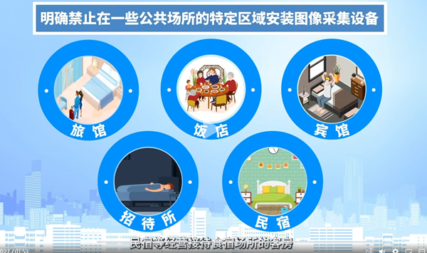 当前,现实生活中存在越来越多违规安装使用图像采集设备侵犯个人隐私的案例,特别是宾馆、民宿、公共卫生间等私密场所尤为突出,给我们的生活带来了严重的困扰。如何在公共安全视频系统建设、使用中有效保护个人隐私,一直是立法工作中重点关注和研究的问题。针对因违法安装带来的侵犯隐私问题,《条例》在认真研究国内外实践做法和地方立法规定基础上,明确规定了禁止安装的区域、部位,主要包括:一是为社会公众提供住宿、休息服务的起居场所,如旅馆、饭店、宾馆、招待所、民宿等经营接待食宿场所的客房或者包间内部。二是为特定人群提供住宿、休息服务的起居场所,如学生宿舍房间内部,单位为内部人员提供住宿、休息服务的房间内部。三是可能暴露个人身体私密部位的区域,如公共的浴室、卫生间、更衣室、哺乳室、试衣间的内部。此外,考虑到实践中可能存在上述分类无法涵盖的情形,作出了必要的兜底规定。